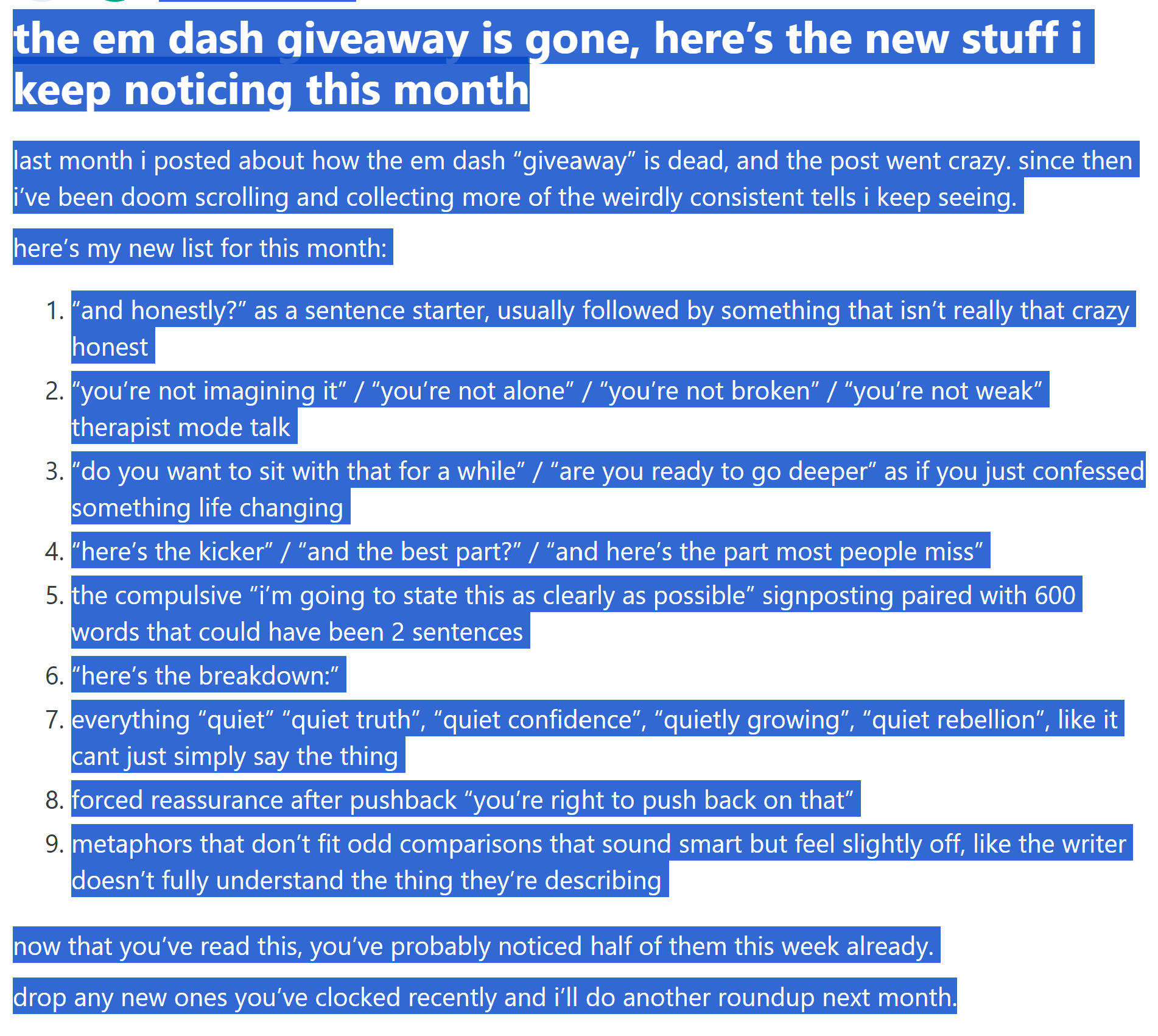 A viral post this week catalogued the new giveaways that AI-generated content keeps producing. The em dash epidemic is fading, but new patterns are emerging.